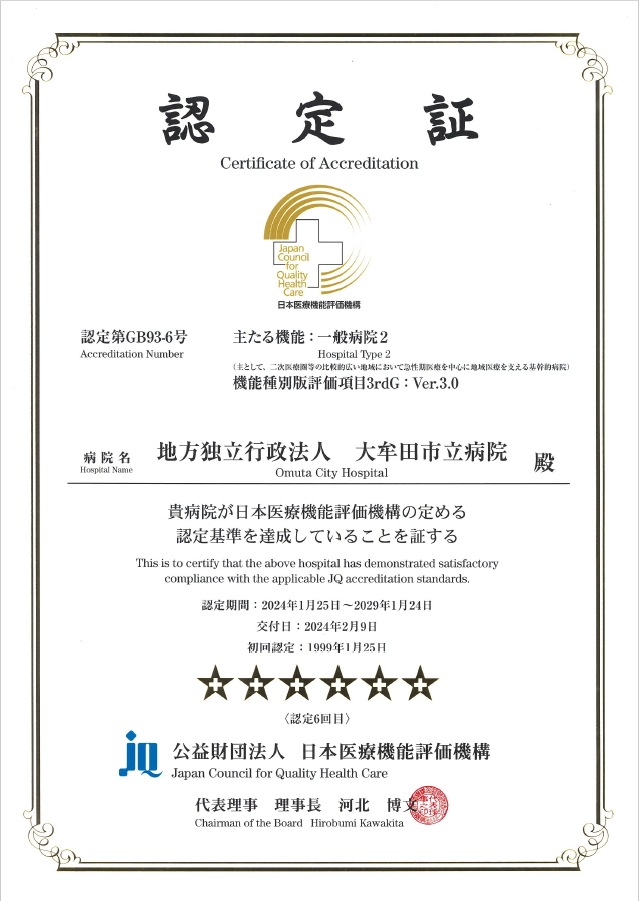 大牟田市立病院は、2024年2月9日付で公益財団法人 日本医療機能評価機構による「病院機能評価(3rdG:Ver3.0)」の認定を取得しました。1999年1月の初回認定から6回目の認定となります。