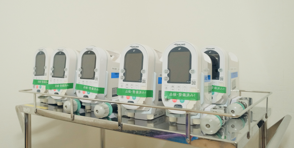 院内には様々な医療機器が配置してあり、輸液ポンプ・シリンジポンプ・人工呼吸器・除細動器・保育器を含む重要な医療機器に関しては、臨床工学技士が計画的に定期点検を行ったり、各メーカーへの点検依頼を行い、事前にトラブルの発生を防ぐことで患者さんの安全に寄与しています。