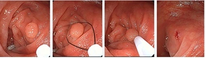 内視鏡を使った治療法には、スネアと呼ばれる金属の輪を病変部に引っ掛け、高周波電流を流して切り取る方法(内視鏡的粘膜切除術; Endoscopic mucosal resection: