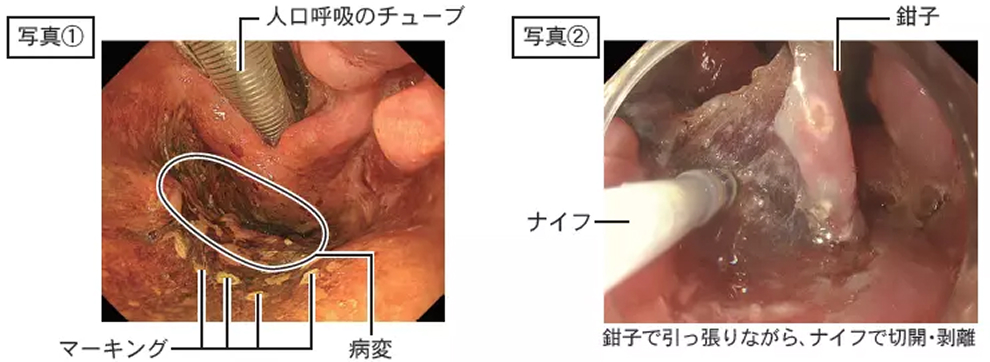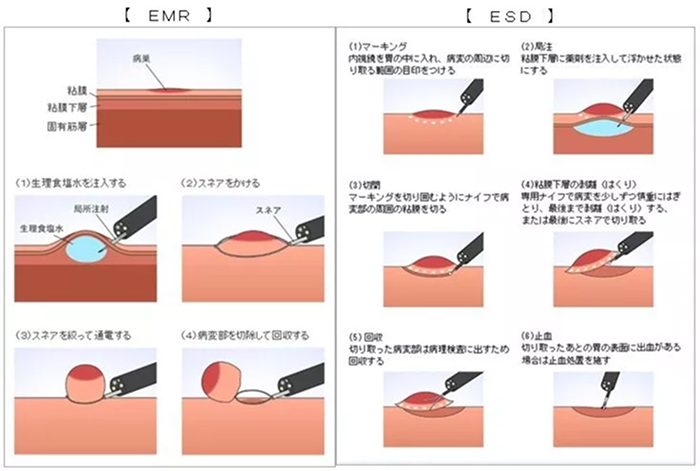 EMR)や、専用の処置具を使ってより大きな病変を切り取る内視鏡的粘膜下層剥離術( Endoscopic submucosal dissection: