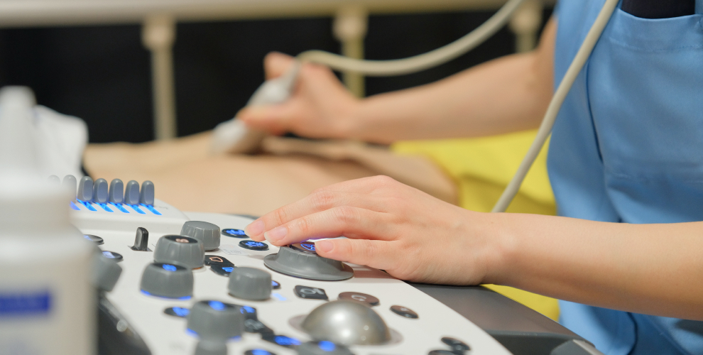 乳房の上から機器をあて、乳腺内のしこりの有無や、またそのしこりが悪性であるかどうかを調べます。