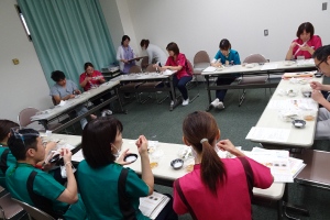 週1回、医師、看護師、管理栄養士、臨床検査技師、リハビリテーション科スタッフ、医療ソーシャルワーカー等とともに血糖コントロールの必要な患者さんの状態把握・糖尿病治療・療養指導に関するカンファランスを行っています。また糖尿病教室においては、薬剤師の視点から薬に関することをわかりやすく説明しています。患者さんの合併症の進展を予防し、QOLの低下を防ぐため、入院前から退院後まで切れ目のない療養指導を心がけています。