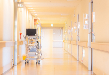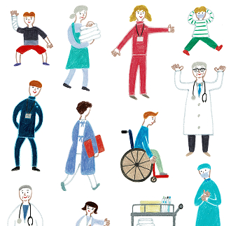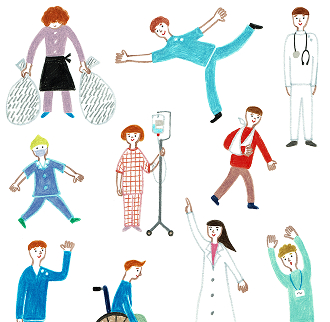 私たちの職場は、1~4階に「 各科の外来 」、3階に「 手術室 」「 ハイケアユニット/救急病棟 」、4階に「 健診センター 」「 腎センター 」があります。