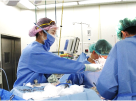 昨年度の手術件数2869症例、そのうち332症例が緊急手術でした。また、外科手術の5割、婦人科手術の4割は腹腔鏡手術を行っています。さらに手術支援ロボットダヴィンチが導入され、新たな医療の提供に努めています。また、迅速に対応できるよう麻酔科や臨床工学科と協力し、他部署と合同でシミュレーション教育にも力を入れています。