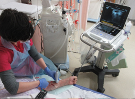 外来維持透析患者さんに対して、定期的検査をもとに食事内容や生活状況などへの指導を行い、医師・臨床工学技士と行うカンファレンスで、より効果的な治療方法について検討しています。さらに患者・家族・医師・看護師、時にはケアマネージャーさんを含めて面談を行い、よりよい生活に繋がる援助を行っています。透析開始前には透析体操を実施したり、透析中のエルゴ運動を促すことで筋力低下予防に努めてます。また、「そらまめくん」という透析患者さんへ向けた新聞を月1回作成・配布し、情報提供しています。穿刺困難な患者さんに対しては、エコーを使用したエコー下穿刺を導入し、安全安楽の提供に努めています。