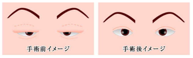 手術は通常全身麻酔下に行い、筋肉を付着部分からはずして短くしてから再度縫合する挙筋前転法か、挙筋の力がない場合には大腿の筋膜でまぶたを吊り上げる筋膜移植を行います。これによって眠たそうな表情は一転して明るい表情となり、視野の確保も可能となります。