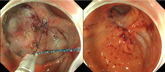 また術後の合併症予防にも力を入れております。創部閉鎖を行うことで術翌日から食事再開することができます。その中でも内視鏡手縫い縫合法(EHS)は日本で3番目(2024年度)の症例数を経験しており、お気軽にご相談ください。