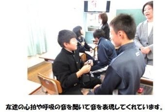 生徒達も先生も友達の心拍を聴いて、「ドックン、ドックン、ドックン。」と声に出して表現してくれました。呼吸音を聴いた生徒が「聞こえた!スースーって!」っと大喜びで教えてくれた姿がとても印象に残ってます。