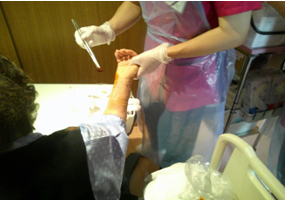 外来維持透析患者さんに対して、定期的検査をもとに食事内容や生活状況などへの指導を行い、医師・臨床工学技士と行うカンファレンスで、より効果的な治療方法について検討しています。さらに患者・家族・医師・看護師、時にはケアマネージャーさんを含めて面談を行い、よりよい生活に繋がる援助を行っています。透析開始前には透析体操を実施したり、透析中のエルゴ運動を促すことで筋力低下予防に努めてます。また、「そらまめくん」という透析患者さんへ向けた新聞を月1回作成・配布し、情報提供しています。穿刺困難な患者さんに対しては、エコーを使用したエコー下穿刺を導入し、安全安楽の提供に努めています。