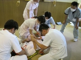 当院は二次救急医療を提供しており、地域・社会の救急医療ニーズに応えるため、幅広い救急看護領域の知識や技術の習得に努めています。現在、初療担当メンバーを中心として定期的に救急搬送症例検討やガイドラインをベースにした勉強会、また他部署や大牟田市の救急隊と合同で急変時対応や外傷看護のシミュレーショントレーニングを行っています。今後も急変を起こさないような看護を実践出来るよう、また急変が起こっても迅速かつ適切に高度な医療が提供できるよう、個々のレベルアップに努めていきます。
